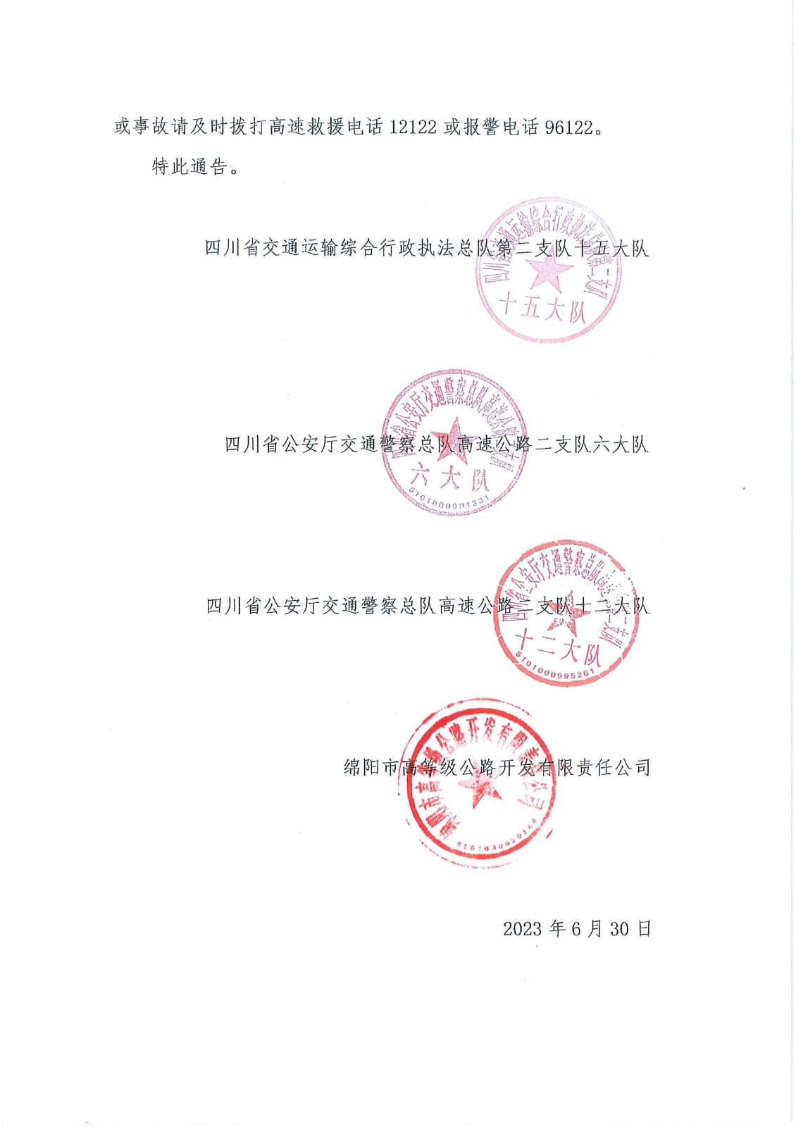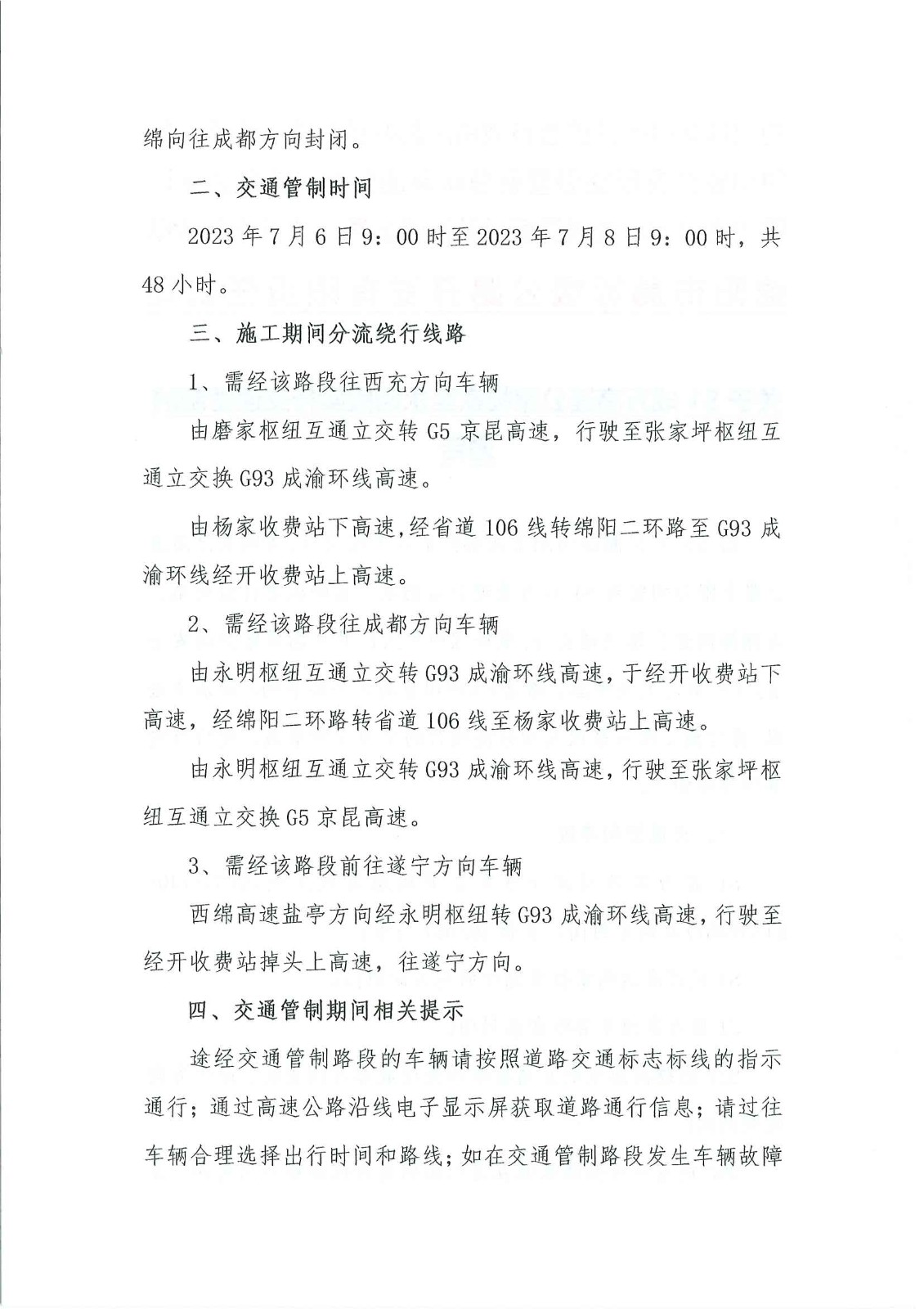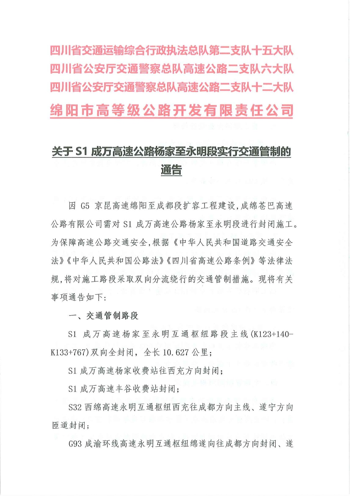關(guān)于S1成萬(wàn)高速公路楊家至永明段實(shí)行交通管制的通告