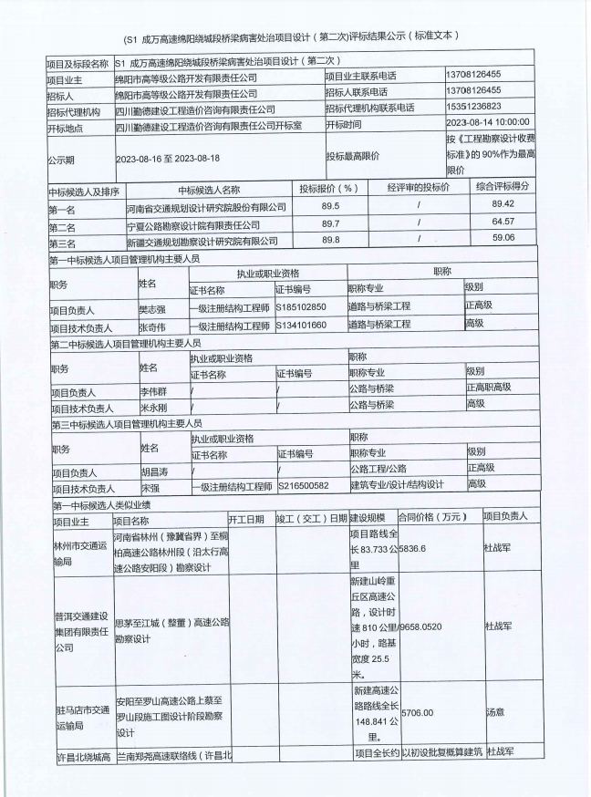 S1 成萬高速綿陽繞城段橋梁病害處治項目設(shè)計(第二次)評標(biāo)結(jié)果公示