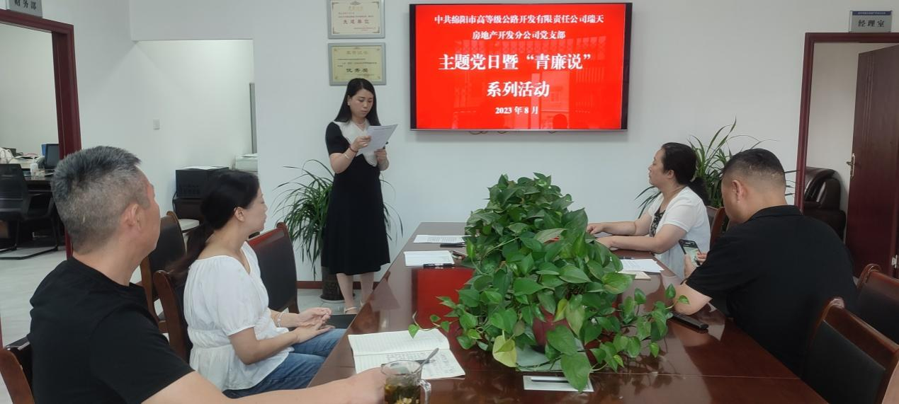 為進一步加強黨員廉潔教育,強化紀律和規(guī)矩意識,8月24日,瑞天房產分公司黨支部組織開展主題黨日暨“青廉說”活動。